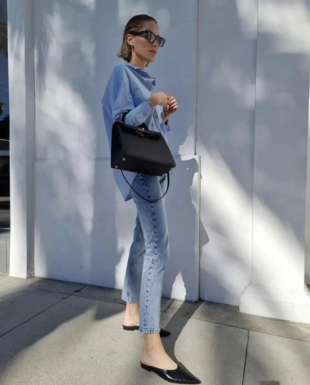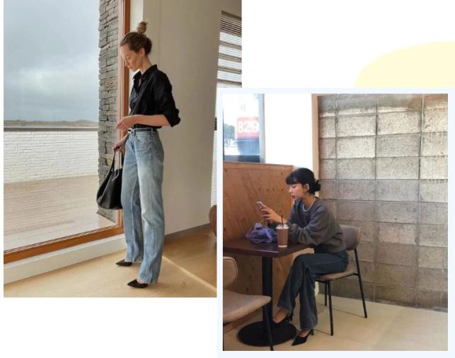 牛仔裤搭配性感妩媚的尖头穆勒鞋,弱化牛仔裤的休闲感,满屏的女人味溢出,更加精致性感!
