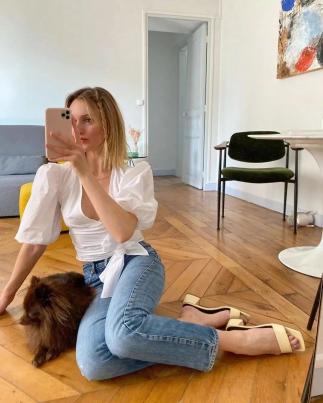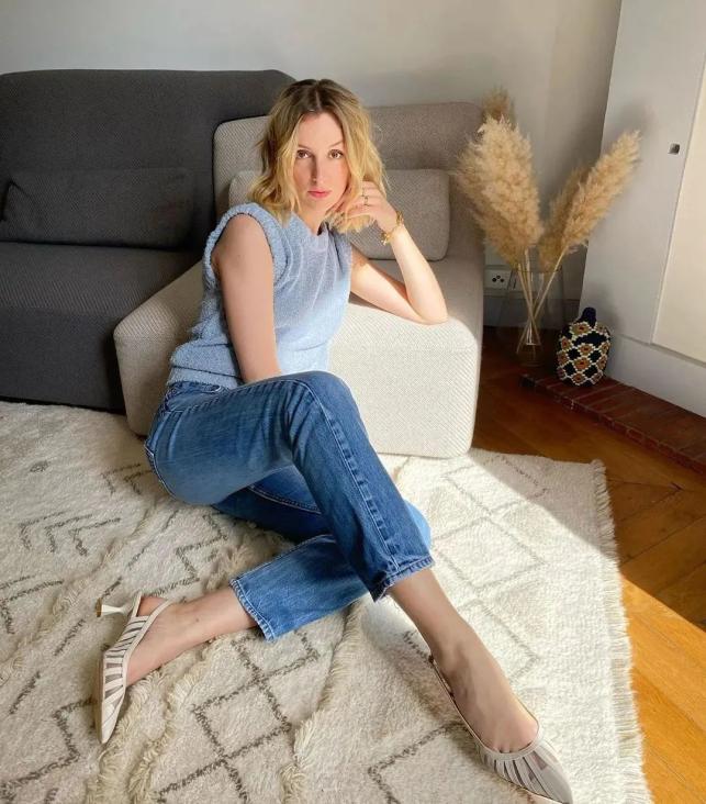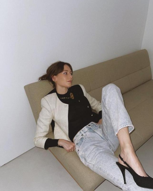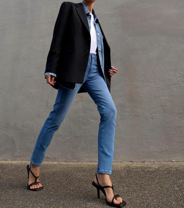 细跟的裸跟鞋搭配牛仔裤,相当于把性感和中性的单品搭配在一起,微妙的时髦被拿捏啦~