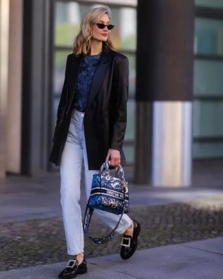 经典的Prada乐福鞋搭配阔腿牛仔裤,裤腿盖过脚面,有一种不羁的感觉,拿捏起来游刃有余~如果乐福鞋包住脚的面积稍大,牛仔裤建议选择九分长度的,微微露肤更能显腿长哦。
