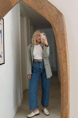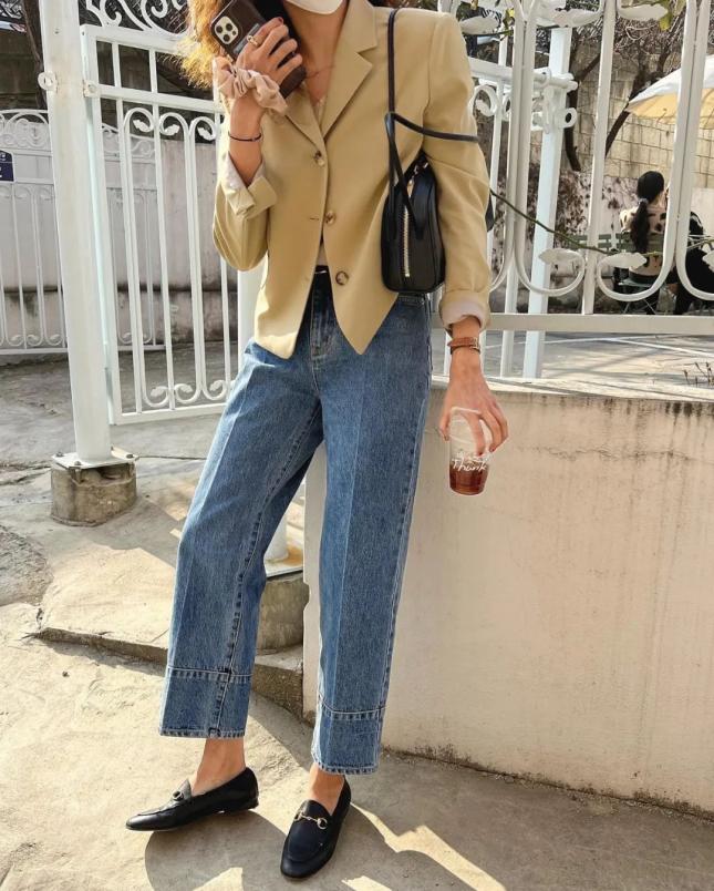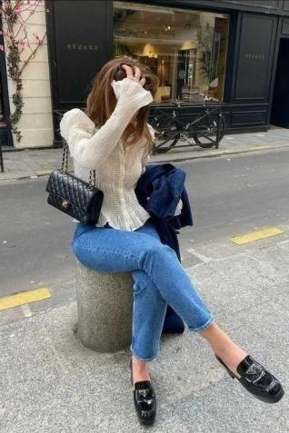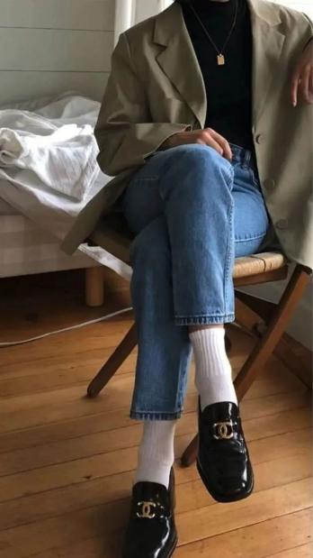 外加金属扣元素的乐福鞋搭深色牛仔裤,则更偏向于大气成熟。