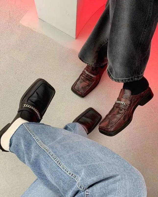 换成方头的穆勒鞋,上半身套一件西装或衬衫,正式感立马就出来了,很适合通勤。