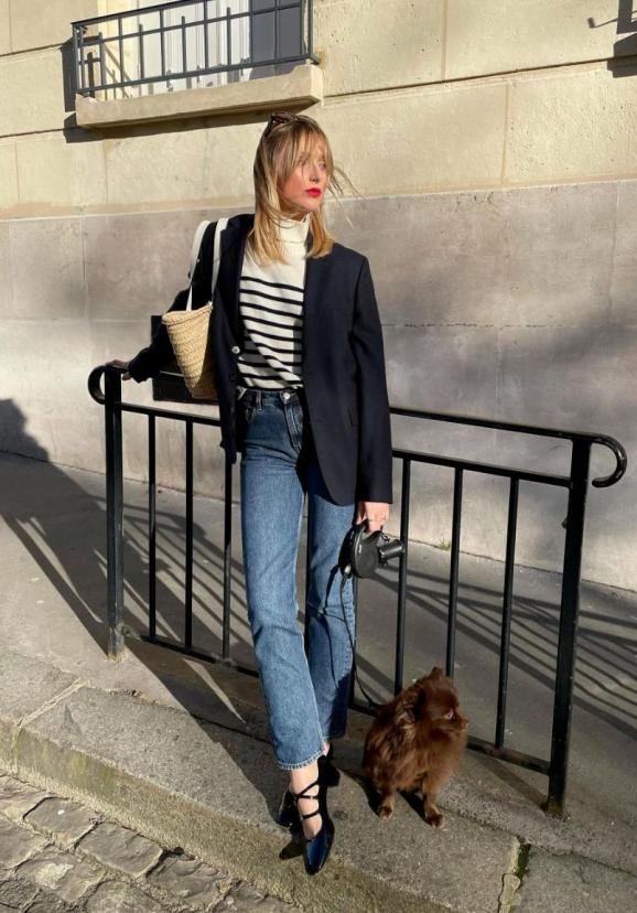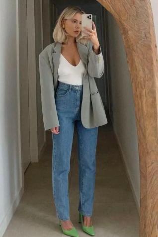 配上牛仔裤与西装,尖头的玛丽珍鞋营造出轻松、愉快的职场氛围同时,也有种优雅气质的感觉~