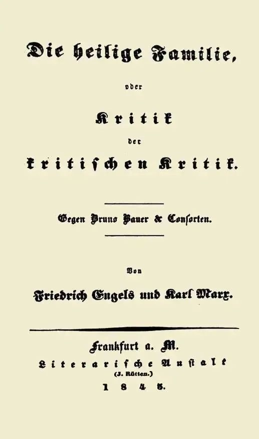 《神圣家族》第1版扉页 | 图源网络1844年前后正是马克思、恩格斯的思想裂变期,可以把他们在这一时期的批判主题归纳为对思辨哲学—宗教异化的批判、异化劳动理论与对私有财产的批判、对唯心主义—旧唯物主义的批判。《神圣家族》中的批判思想展现了他们对历史进程的理论自觉。虽然他们的批判思想仍然残留抽象人本主义的痕迹,但是他们是站在整体性的高度把握人的。他们认为,人的整体性是历史地生成的,要在实践中呈现人的整体性,不仅实现对自己的扬弃,而且把“人类社会”之前的历史都看作是实现人的整体性的否定性环节。