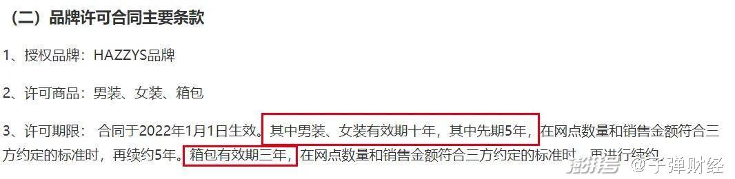 按照规定,男装、女装有效期10年,其中先期5年,在网点数量和销售金额符合三方约定的标准时,再续约5年;箱包有效期3年,在网点数量和销售金额符合三方约定的标准时,再进行续约。
