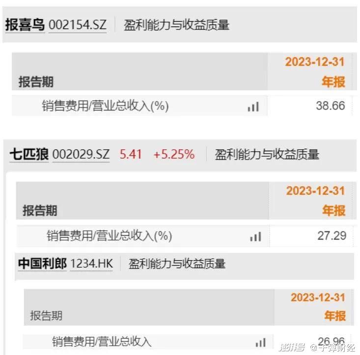 Wind数据显示,2023年,同行上市公司七匹狼、中国利郎的销售费用率分别为27.29%、26.96%,而报喜鸟高达38.66%。