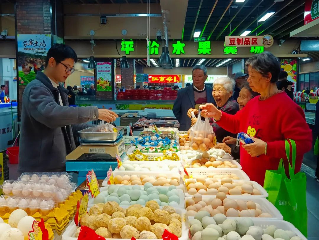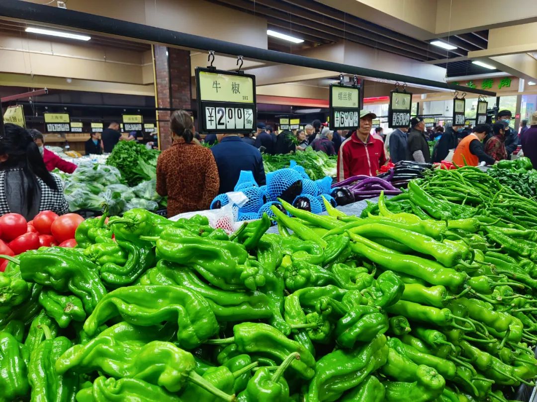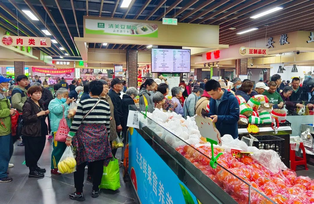 一大早,刚刚开业的田间地头农贸市场内便已人头攒动,排队称重结算的长队堪称“壮观”。记者看到,市场内,86个摊位分区明晰,囊括了蔬菜、水果、肉类、海鲜、水产、粮油、熟食等多个品类。摊位上,各类产品都已码放整齐并清晰标价。