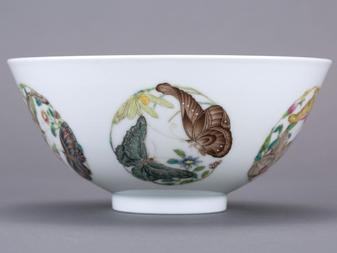 观复博物馆藏有一件【清雍正粉彩团蝶纹碗】,胎体坚致细腻,通施白釉,外壁绘粉彩团蝶纹五组,每组团蝶纹由两只相异的蝴蝶与四季花卉纹构成。