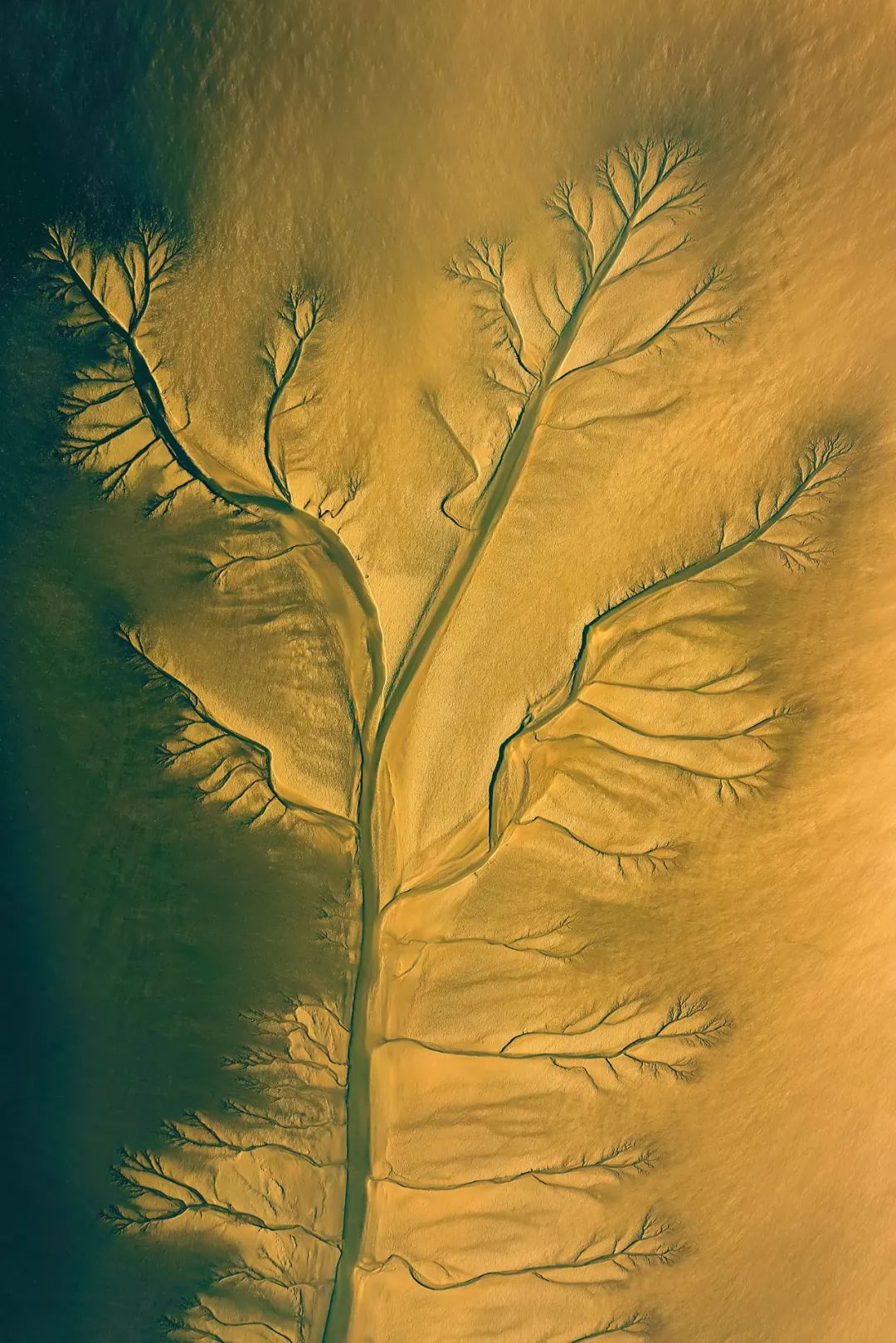 广袤的滩涂上,海水与陆地的争夺仍在进行。潮流往复,潮水在进退之中冲刷出万千条沟壑,海水在其中如同溪流般潺潺流动,最终万千沟壑汇成数条主干渠流回海洋的方向,在大地上形成了一棵棵状如大树的景观,这种景观被命名为“潮汐树”。