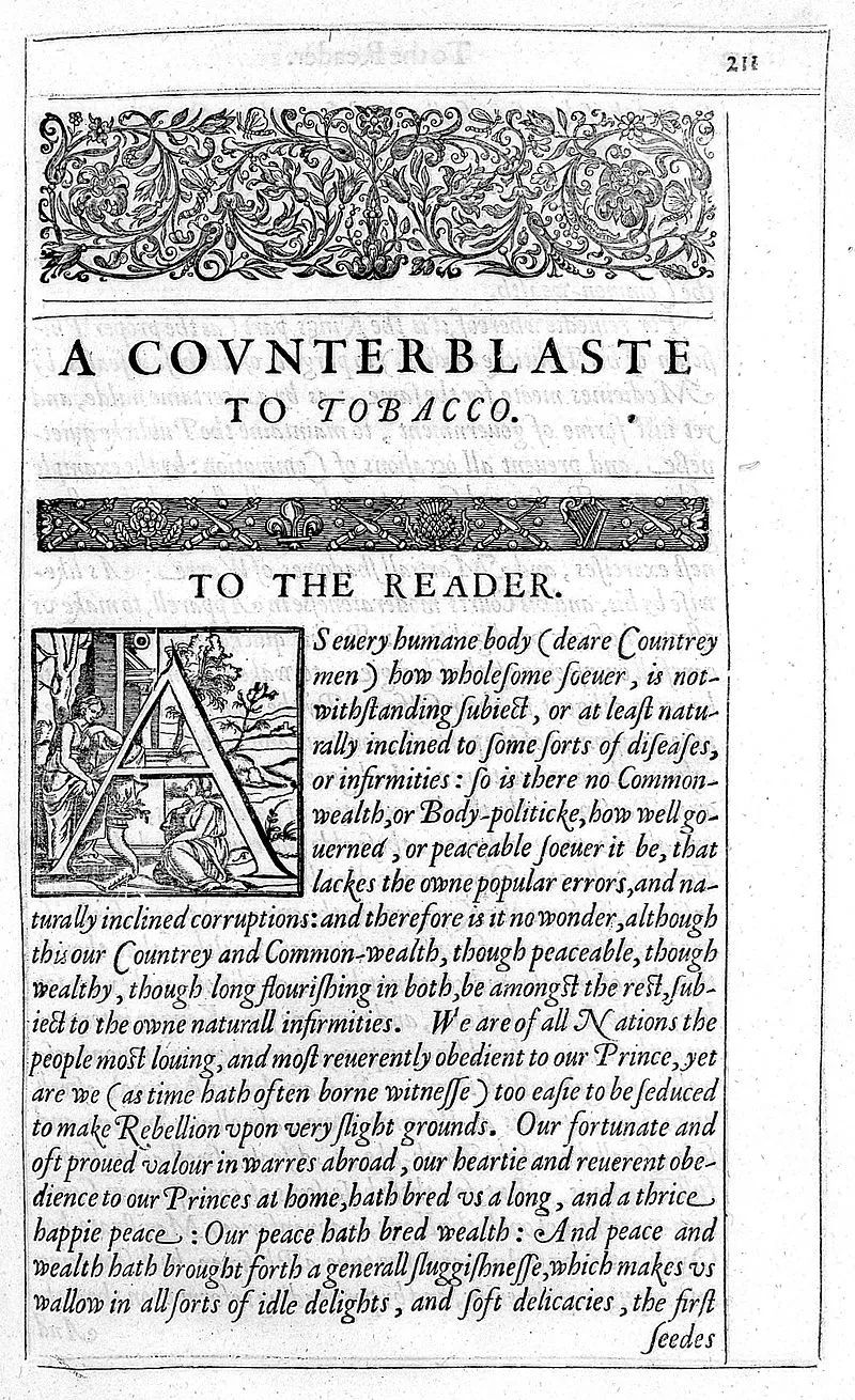 詹姆斯六世于1604年撰写的一则文章,也是最早的反烟草出版物之一。于是另外一种更为精致的无烟烟草制品广受追捧——以干燥的烟叶磨粉制成的鼻烟。