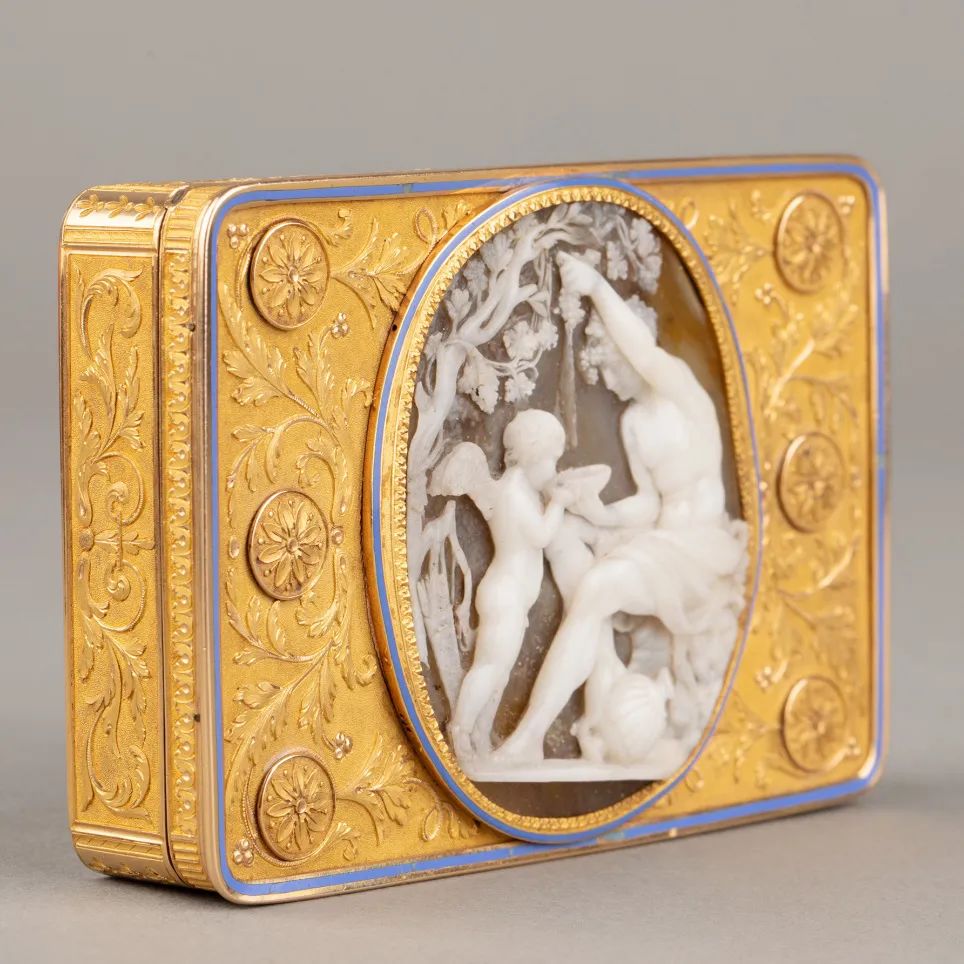 酒神与丘比特主题浮雕圆章鼻烟盒