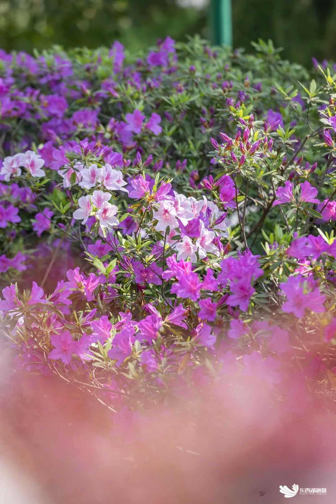 吴家山公园(临空港大道)路边,杜鹃花竞相绽放。火红、粉红、玫红、紫红、粉白