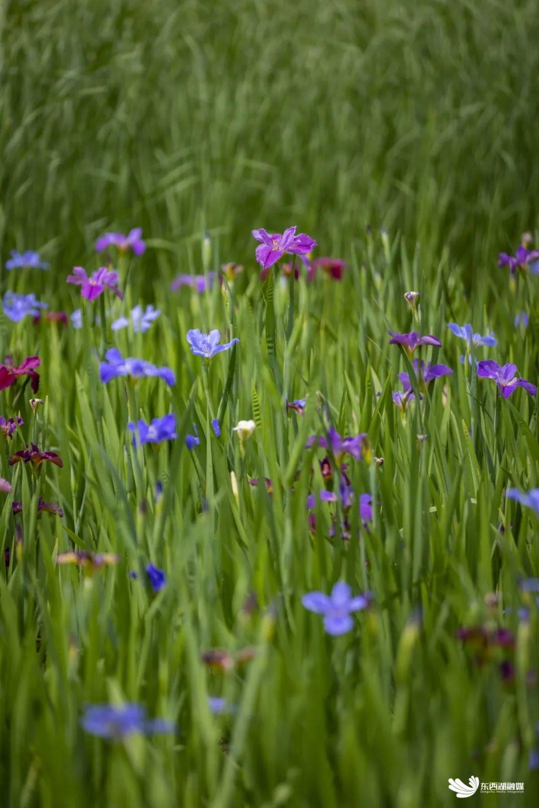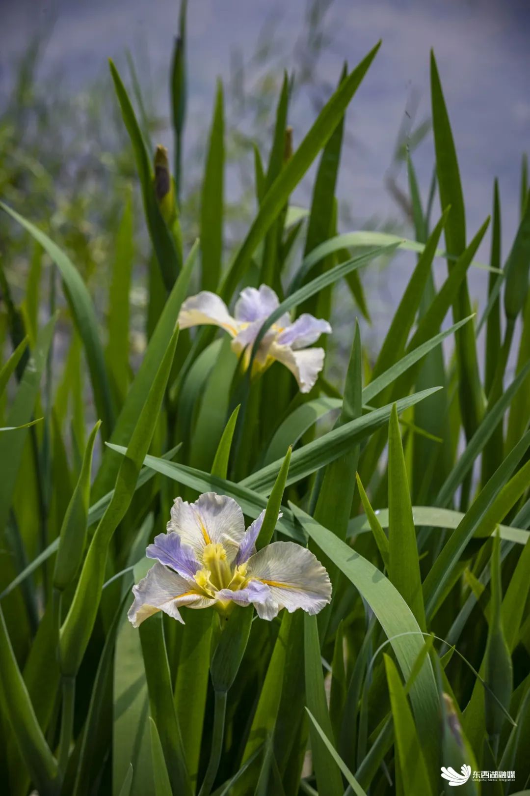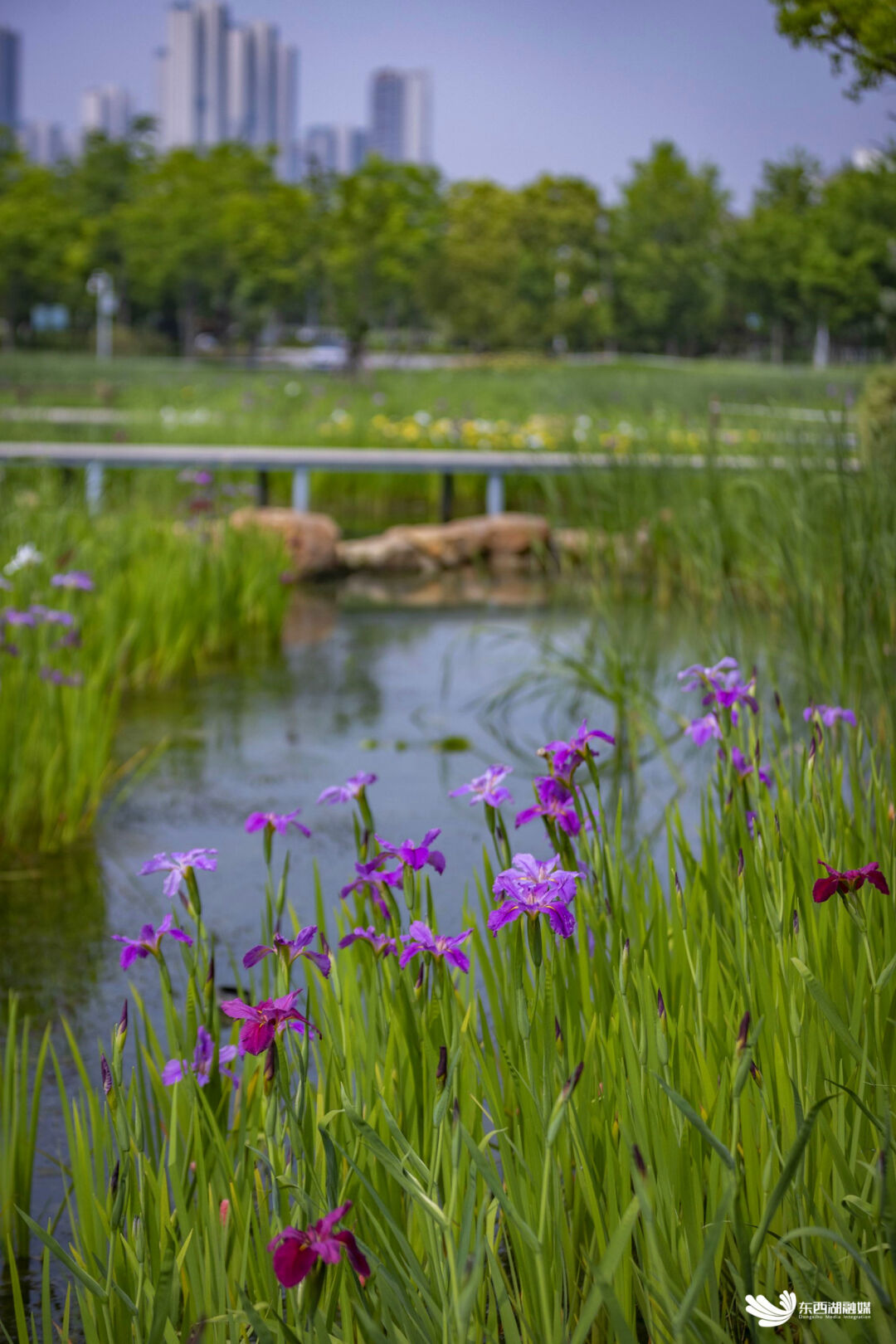 金银湖鸢尾花园,盛开的花朵与小桥流水宛如一幅油画。花瓣向上翘起