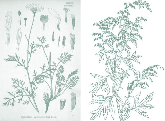 (左)白花除虫菊(《科勒药用植物》)、(右)野艾蒿(《植物名实图考》)我国大部分的地区都产五月艾,在江浙一带,它更是一种极常见的植物。也许夹放在书中的干草失色变形,普通人很难认出其本来面目吧。即便参观者看出芸草就是寻常的五月艾,碍于主人面子,大概也不好揭穿。