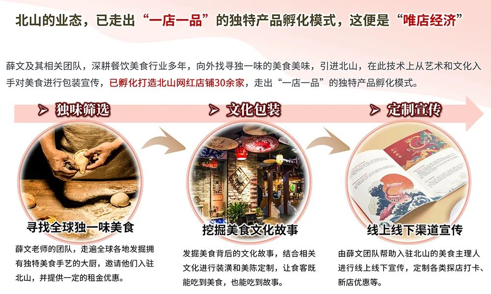 唯店经济的背后是「一店一品」的定制孵化。具体而言,薛文团队的盈利模式不再简单地停留于「你要房、我要钱」的佛系收租模式,而是走出了一条「我选你、我帮你、你运营」的定向筛选和定制包装模式。就用北山蒸蒸日上的美食经济来讲,薛文团队深耕餐饮美食行业多年,深入国内外找寻拥有「独一味」美食的创意主理人,将其引进北山,在此基础上从艺术和文化入手对美食进行包装宣传,现已孵化打造北山网红店铺30余家,助力北山成为珠海独一无二的「唯店街区」。