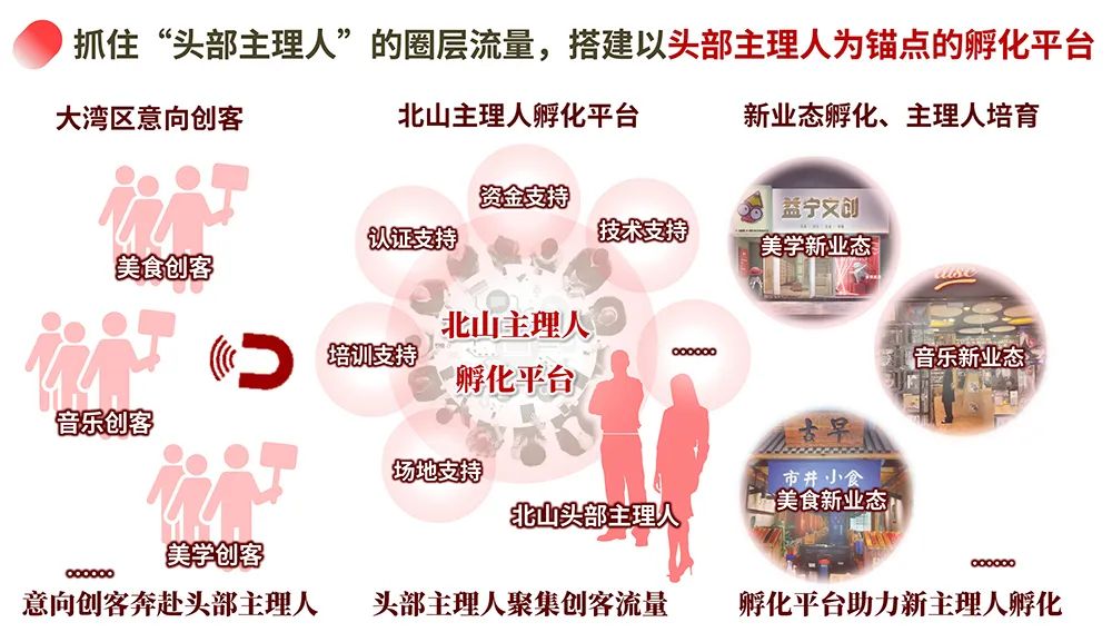 在此基础上,华高莱斯进一步建议北山在既有的「北山唯店经济」模式之上,建立一个完整的「北山主理人孵化机制」,继续以北山的头部主理人为流量牵引,为大湾区的各类创客提供场地支持以外的多项支持,如培训支持、宣传支持、资金支持等等,助力北山持续孵化美学、音乐和美食新业态。