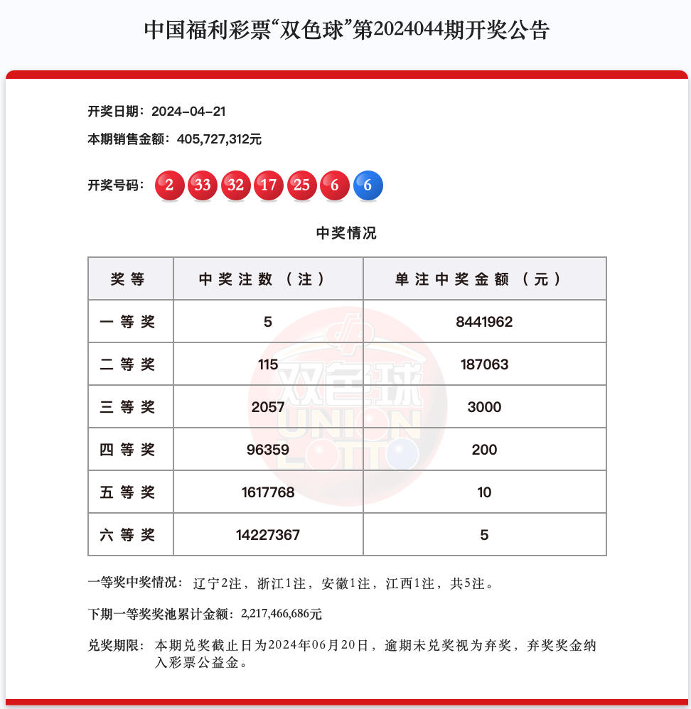 本期开奖概况本期双色球全国共开出5注一等奖,辽宁2注,浙江、安徽和江西各1注,单注奖金8441962元。本期销量4.05亿余元,筹集公益金1.45亿余元。下期一等奖奖池累计金额为22.17亿余元。