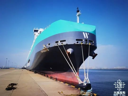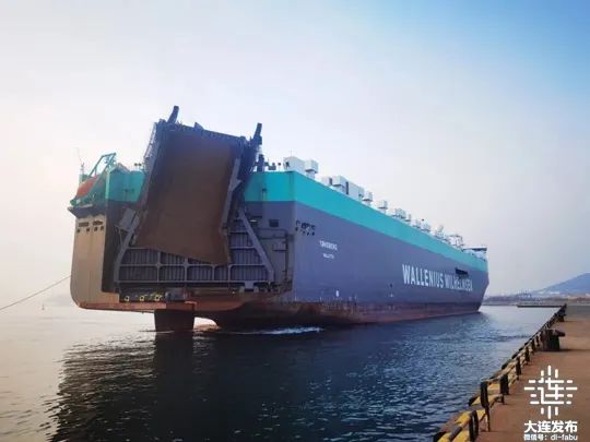 “腾斯贝格”轮船长265米,宽32.26米,吃水8.1米,总吨75251吨,是大连港靠泊的最大汽车滚装船。