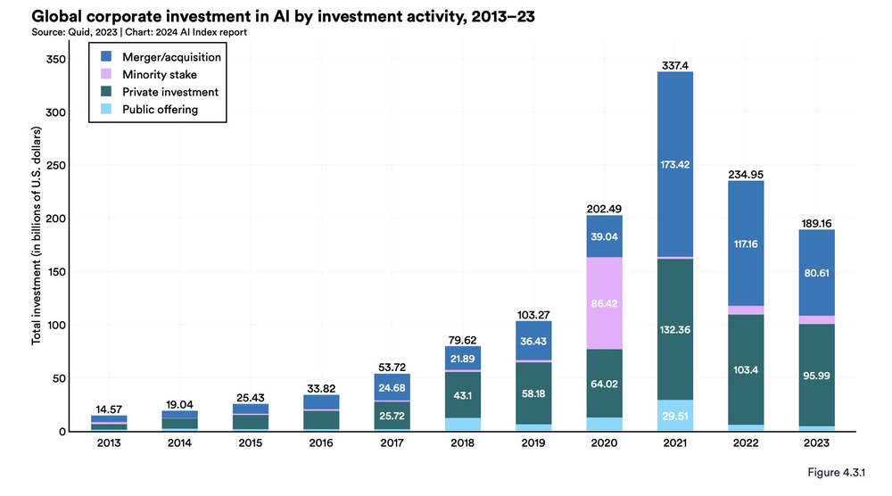 2023年人工智能的讨论度与李世石战胜阿尔法狗时相比,有过之而不及。但据斯坦福大学人工智能研究所(HAI)的最新报告显示,2023年全球人工智能投资连续第二年下降,人工智能相关并购从2022年的1171.6亿美元下降至2023年的806.1亿美元,下降31.2%;私人投资从1034亿美元下降至959.9亿美元。总体来看,去年人工智能的总投资降至1892亿美元,比2022年下降了20%。