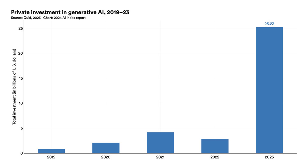 值得一提的是,2023年生成式AI吸引了252亿美元的投资,几乎是2022年的9倍,是2019年的30倍。此外,2023年,生成式人工智能占所有人工智能相关私人投资的四分之一以上。