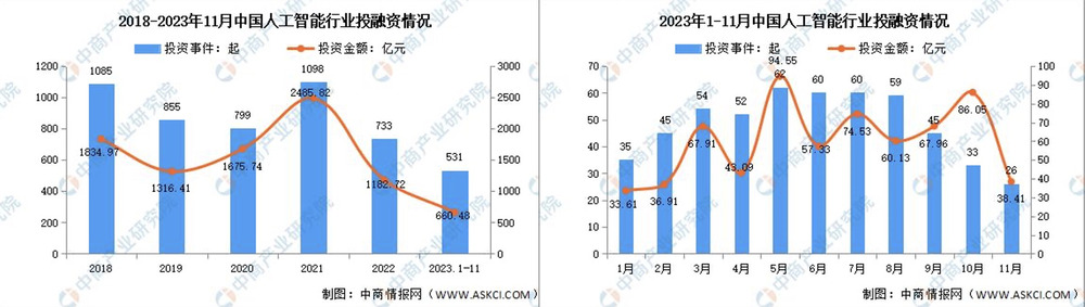 结合中商情报网统计的2018-2023年11月中国AI投融资情况及2023年各月份AI投融资数据来看,2018年和2021年是过去AI领域投资金额和投资笔数的相对高点,2023年的AI投资金额和出手次数实际低于2022年。