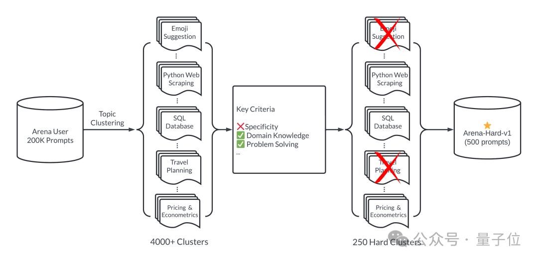 新基准测试如何运作?简单来说,通过大模型竞技场20万个用户查询中,挑选500个高质量提示词作为测试集。