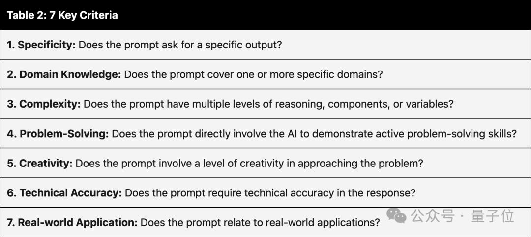 同时确保入选的提示词具有高质量,有七个关键指标来衡量:具体性:提示词是否要求特定的输出?