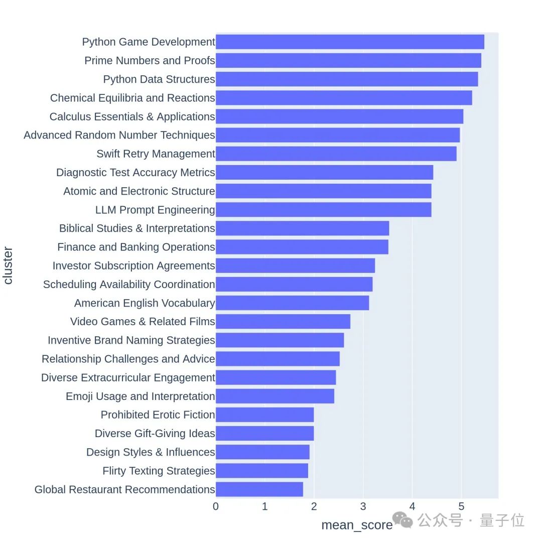 使用GPT-3.5-Turbo和GPT-4-Turbo对每个提示进行从 0 到 7 的注释,判断满足多少个条件。然后根据提示的平均得分给每个聚类评分。高质量的问题通常与有挑战性的话题或任务相关,比如游戏开发或数学证明。