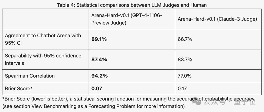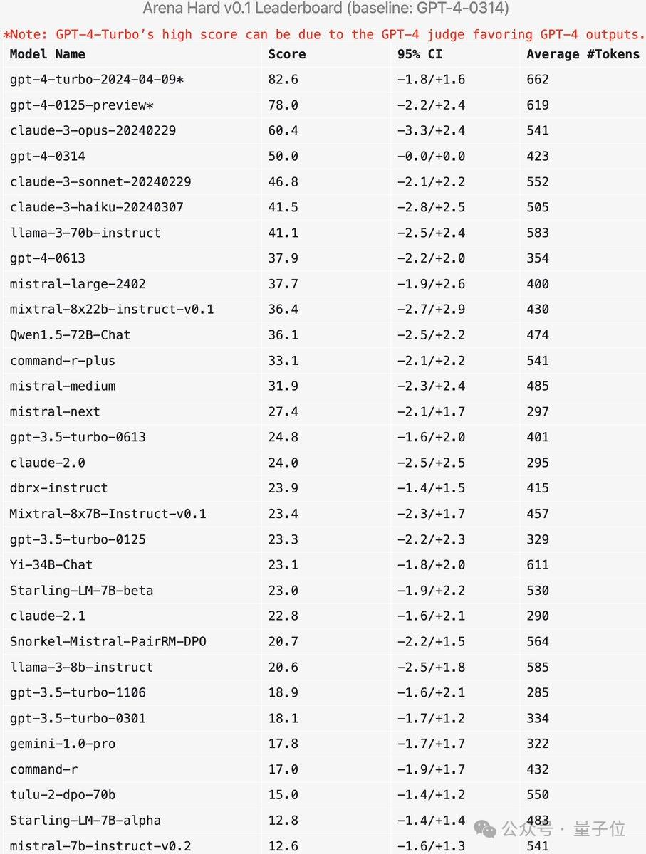 与之前大家分数都相近的MT Bench相比,Arena-Hard区分度从22.6%提升到87.4%,孰强孰弱一目了然。Arena-Hard利用竞技场实时人类数据构建,与人类偏好一致率也高达89.1%。