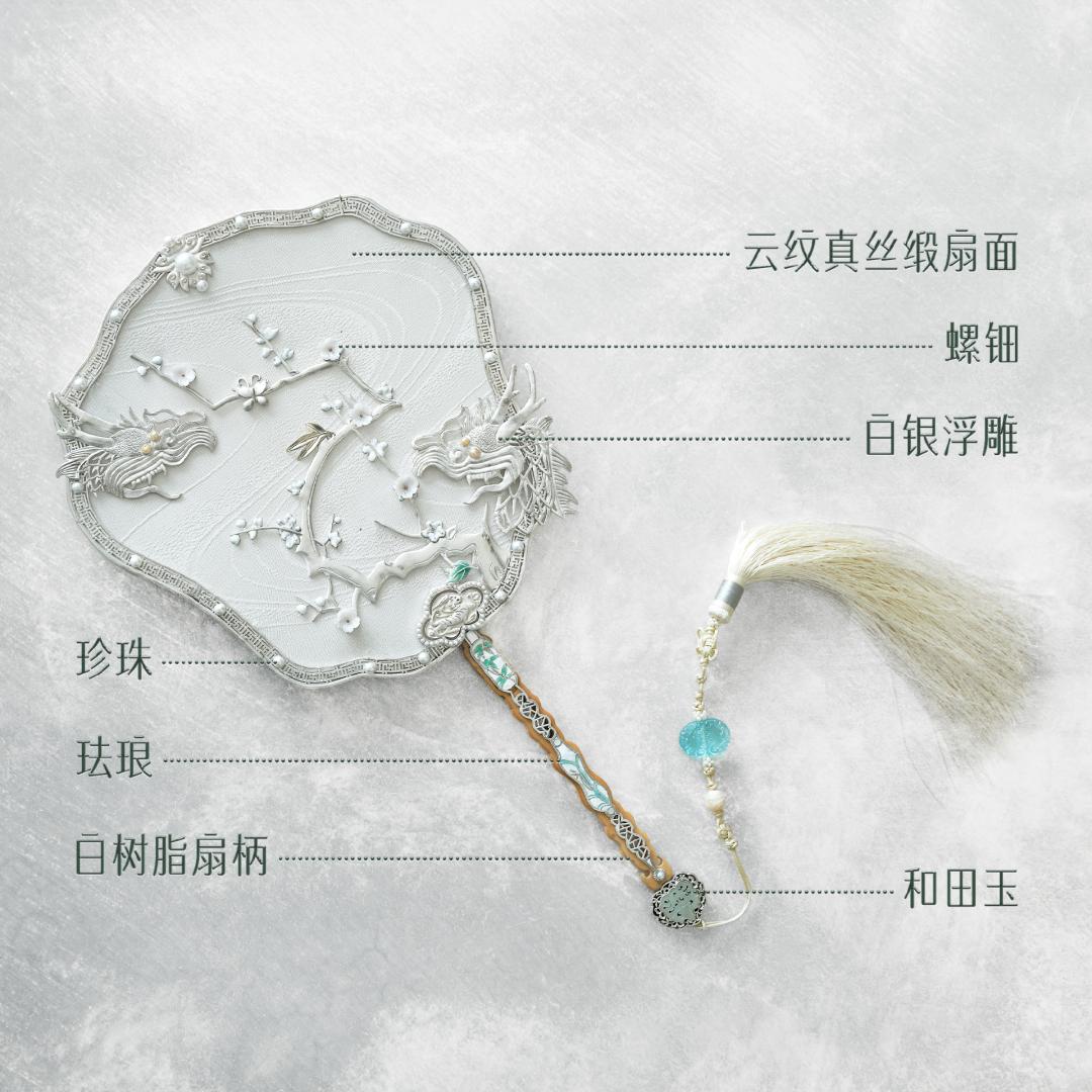 我后来去考究了这把团扇,说是在设计中运用了“7种白”,包括白银、珍珠、和田玉、螺钿、白色珐琅、云纹真丝缎、玛瑙。用锦缎作扇面,玛瑙做扇柄,再以白银、珍珠、白玉、螺钿、珐琅点缀,两条银龙盘飞之间呼之欲出。