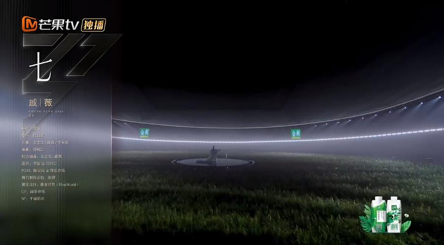 戚薇本人的强大气场,在圆形舞台中展现得淋漓尽致。待舞台全部亮起时,圆形舞台上又有一朵花在空中炸开,配合歌词“在此年,化作龙腾雨”恰到好处。在歌曲结束时,这朵大花又再次聚合,形成一个完整的闭环。