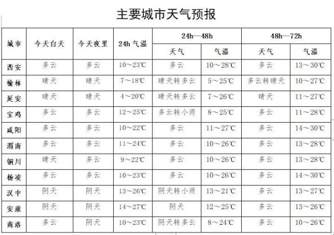 30日:全省阴天,陕北南部、关中大部和陕南大部有小雨。