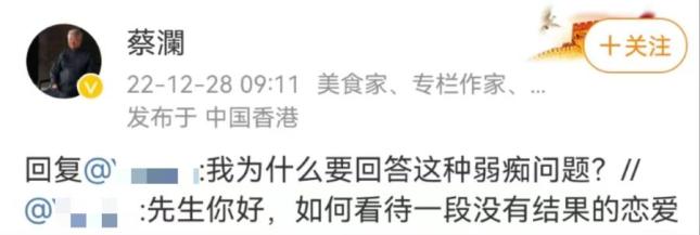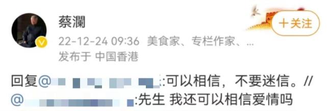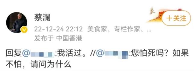 而年过八十的蔡澜将这三个忌讳破得很彻底:他经常追忆诗酒年华,曾每年固定时间在微博回答网友们的人生难题,教育年轻人。