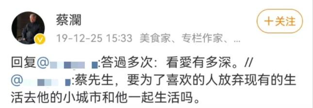 但有人网友问到要不要为了喜欢的人放弃现有的生活去对象的城市发展,蔡澜没有简单劝分或者劝和,无论是去大城市还是小城市,不用长篇大论,也没有该与不该,看爱得有多深。