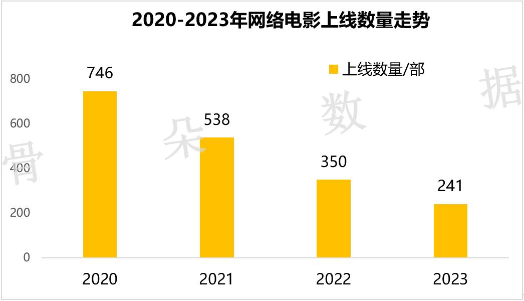 据骨朵数据统计,2023年共上线网络电影241部,比2022年减少109部,同比下降31%,如果跟2021年相比,降幅更达55%。