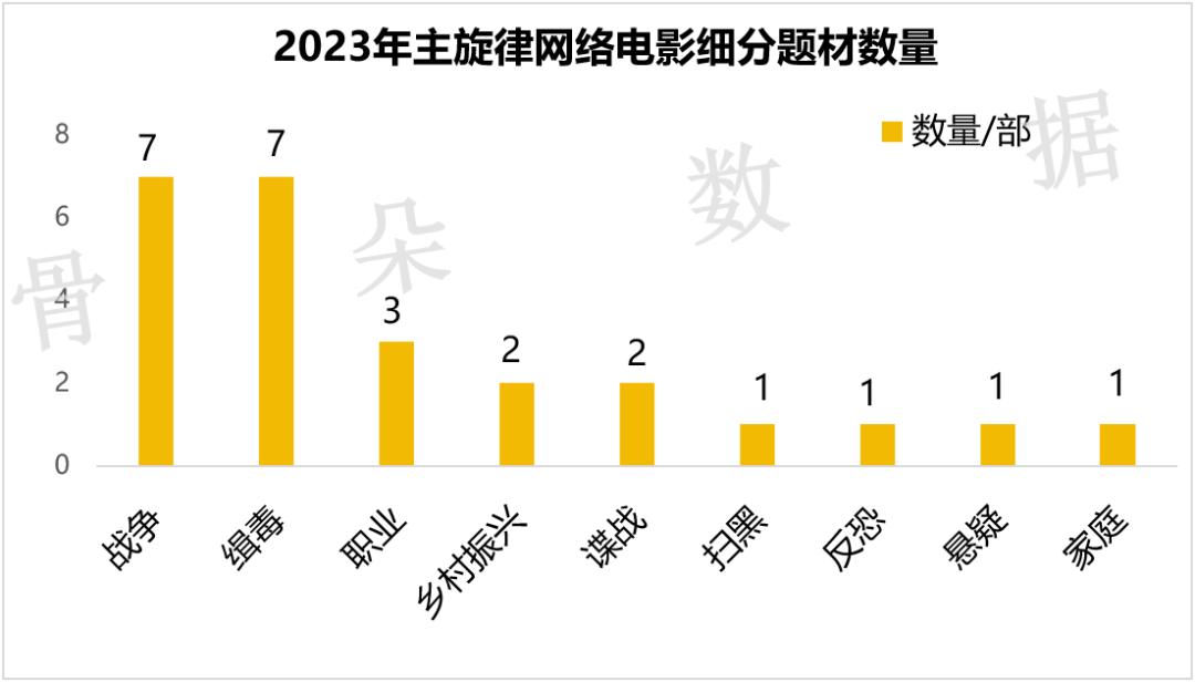 值得注意的是,2023年共上线主旋律网络电影25部,在全年总数量中占比约10%。主旋律网络电影共涉及9 大题材,其中,战争、缉毒题材影片数量最多,均为7部。