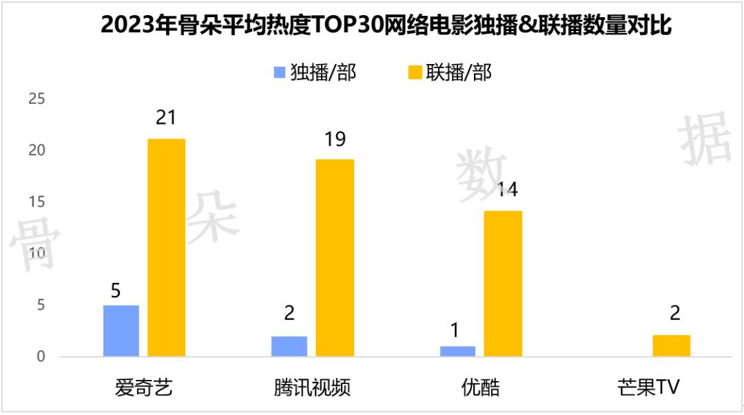 对比各平台,爱奇艺表现最佳。骨朵平均热度TOP30中,爱奇艺独播网影5部、联播网影21部。