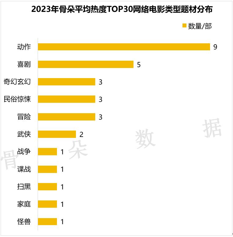 而具体到类型题材上,骨朵平均热度TOP30中,动作片数量最多,为9部,占比30%,其次喜剧片,为5部。另外,奇幻玄幻、民俗惊悚、冒险这三个类型的网络电影均有3部。