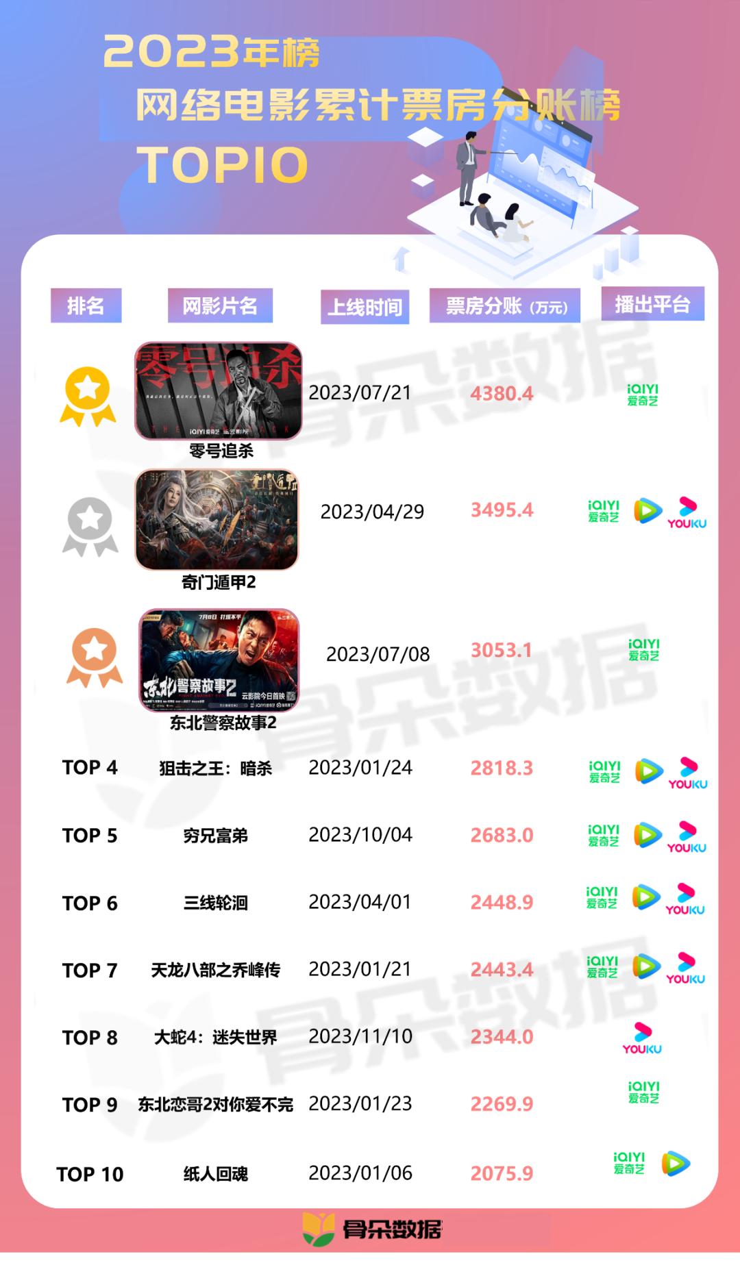2023年,票房分账4000万+的网络电影只有1部,为动作片《零号追杀》;有票房分账在3000万-4000万之间的网络电影2部,分别为《奇门遁甲2》《东北警察故事2》。