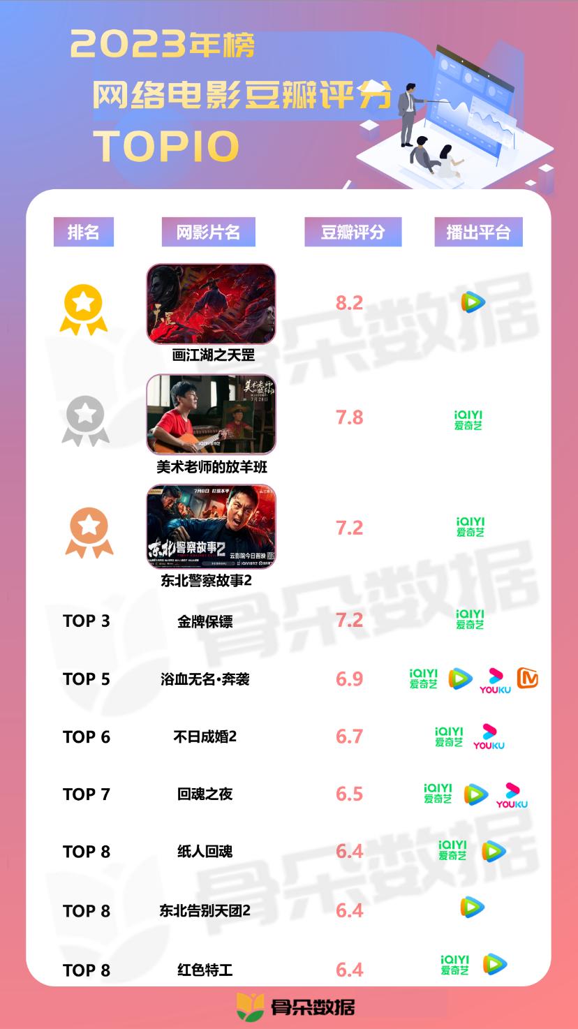 骨朵数据还统计了2023年网络电影豆瓣口碑情况,其中TOP3依次为《画江湖之天罡》《美术老师的放羊班》《东北警察故事2》。