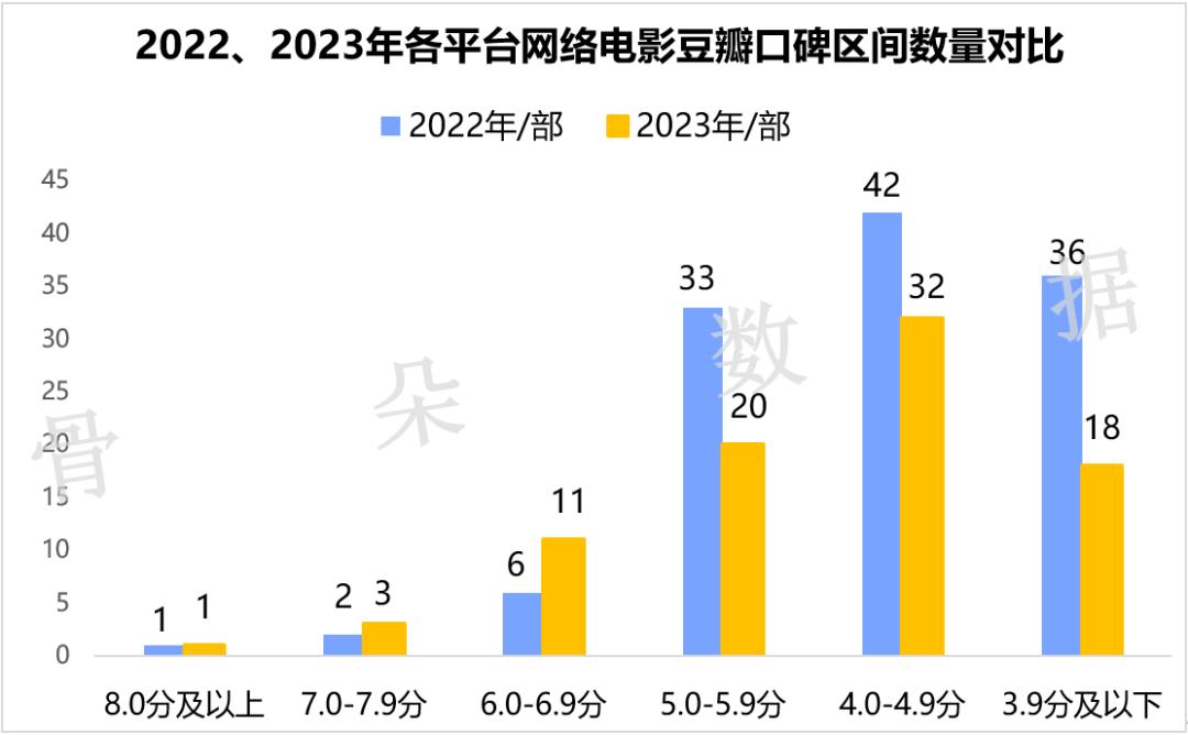 2023年网络电影整体口碑比2022年有所提升。在低分段,豆瓣评分4.9分及以下的网络电影为50部,比2022年减少28部;在高分段,豆瓣评分6.0分及以上的网络电影为15部,比2022年增加6部。