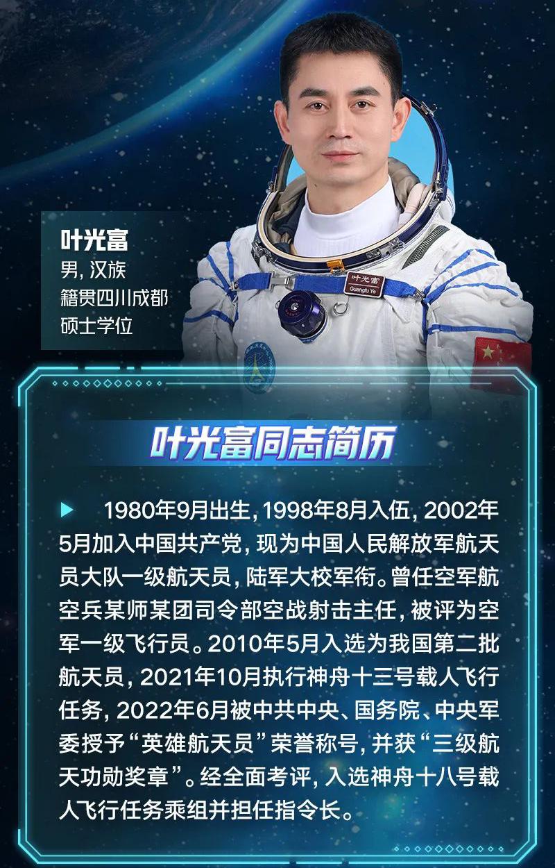 左右滑动查看神舟十八号乘组简历其中航天员李广苏是神舟十八号航天员乘组当中的新面孔,他就是第三批18位航天员里唯一的文科生。经过三年多的刻苦训练,他完成了从飞行员到航天员的转变。
