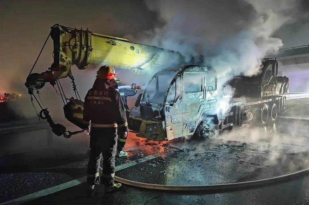 2024年4月16日22时42分,武汉市蔡甸区G50沪渝高速距武汉西收费站出口约一公里的匝道处,一辆起重吊车突发起火。接到报警后,武汉市消防救援指挥中心立即调派全力消防救援站出动2辆消防车、12名消防员赶赴现场处置。消防员到达现场后发现,一辆20吨起重吊车停靠在最右侧车道上,车内无人员被困,吊车左侧前轮及车头部位火势正猛烈燃烧,现场浓烟滚滚。消防员立即对现场周边设置警戒,并出动两支水枪对火势进行打压。在水枪持续喷射过程中,吊车车头部位向外冒出大量的白色浓烟。几分钟后,现场明火被扑灭。随后,消防员持续利用水枪对吊车起火部位进行降温,在仔细检查确认无复燃危险后,将现场移交给相关部门处理。