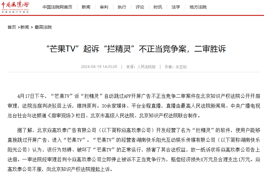 二审胜诉!“拦精灵”屏蔽“芒果 TV”开屏广告构成不正当竞争