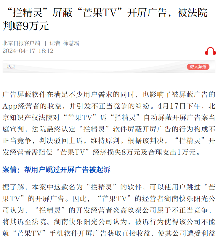 “拦精灵”屏蔽“芒果TV”开屏广告,被法院判赔9万元