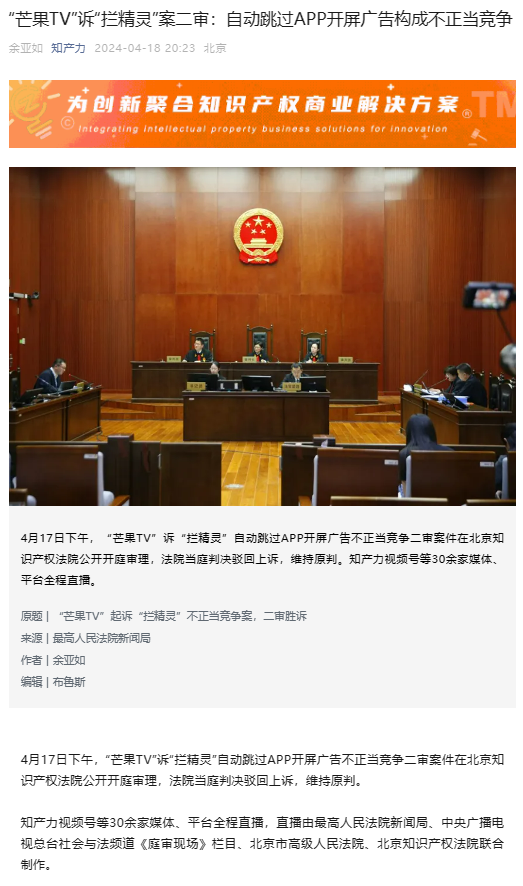 4月17日下午,北京知识产权法院公开开庭审理“芒果TV”诉“拦精灵”自动跳过APP开屏广告不正当竞争案,最高人民法院新闻局、中央广播电视总台社会与法频道《庭审现场》栏目、北京市高级人民法院、北京知识产权法院联合直播。新华社、人民日报、法治周末、人民法院报、北京广播电视台《民法典通解通读》栏目、北京广播电视台《法治进行时》栏目、北京广播电视台北京新闻广播、北京日报、北京政法网、《人民法治》杂志、21世纪经济报道等31家媒体同步直播,最高人民法院新媒体、北京政法新媒体,人民法院报、中国法院网、北京广播电视台、新京报论法有方客户端、北京日报客户端等近10家权威主流媒体深度报道,近500万社会公众在线关注。