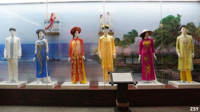 放眼整体,服饰搭配依稀散发着中国旗袍的气韵,原来京族服饰的领子形似旗袍领,但肩袖处做成“斜肩”以示区分,下身还搭配一条裤子,如此一看,既集结汉服的流畅飘逸,又糅合了旗袍的优雅高贵,京族人民是懂“集大成”的。