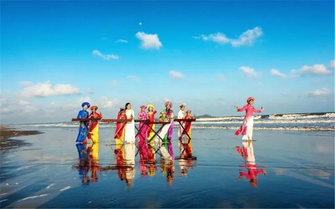 传统捕捞方式——踩高跷捕鱼,该劳作方式已成为当地旅游热门表演项目。外在的美感,是京族服饰吸引世人目光的独家法宝;内在的舒适实用,也是勤劳智慧的京族人民永恒的追求。京族服饰这一份兼容并蓄的美,将由京族人民赓续传承、发扬光大。