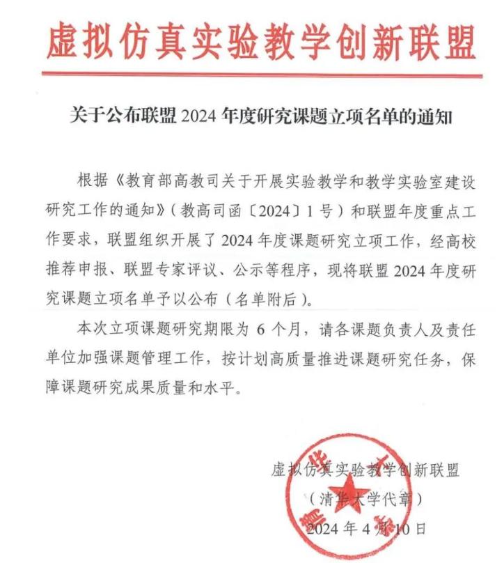4月12日,虚拟仿真实验教学创新联盟下发的《关于公布联盟2024年度研究课题立项名单的通知》,公布了联盟2024年度研究课题立项名单。土木工程学院“土建工程理实一体化虚拟仿真实验室建设”项目成功立项,这是继“省级虚拟仿真实验教学示范中心”“高等学校虚拟仿真教学创新实验室项目”“高等学校虚拟仿真教学创新实验室项目案例团队”之后的又一喜讯。