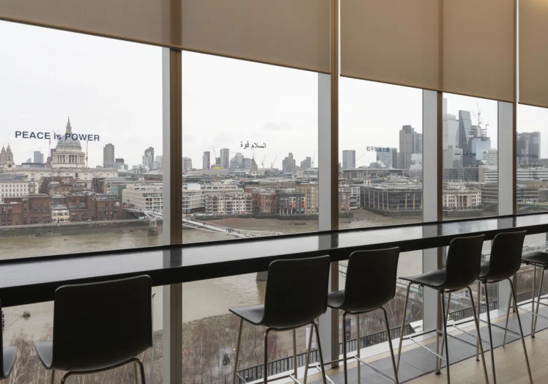 这次展览中我最喜欢的一件作品其实并不在展区里,而是在美术馆的户外区域,叫作《和平就是力量》(Peace is power),它被翻译成24种不同的语言安装在泰特美术馆六楼的窗户上,俯瞰整个伦敦的天际线。