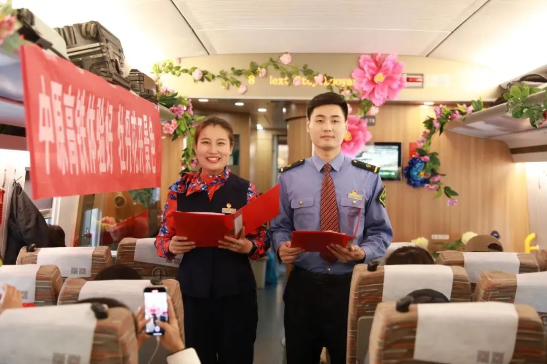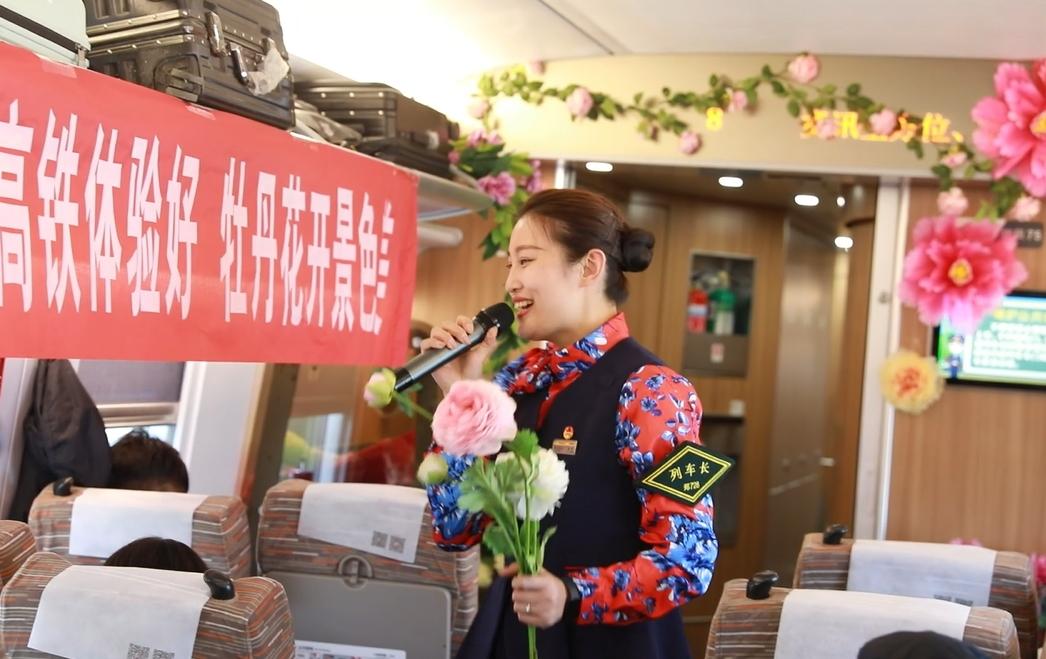 在牡丹经典古诗词朗诵环节,乘务员和旅客你来我往、佳句不断,笑声和掌声在高铁车厢内此起彼伏。